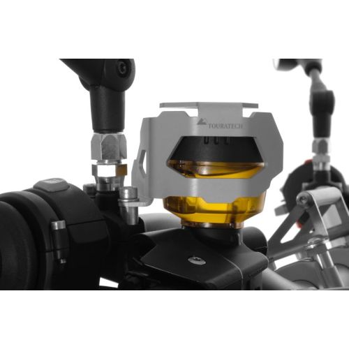 The screw-on caps of the front brake fluid reservoirs are, of course, fitted at the factory with a safety mechanism but because of their exposed position and because the caps are so handy they are very often messed about with and turned. Therefore, after a relatively short time it is possible to unscrew the cap easily without tools. Our guard quite simply prevents this. The guard is screwed on and off quickly and the cap can no longer be grabbed easily. The whole reservoir is also protected.