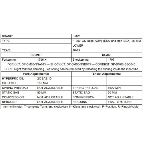 Replacement fork springs for lowering the front end by Dutch suspension specialists Hyperpro. This spring set provides you with a practical -25mm reduction in height without worsening the riding characteristics - at the expense of a little ground clearance. These progressive springs have been designed to match the BMW F850GS/BMW F850GS Adventure perfectly, offering a tremendous improvement in response and greater safety in extreme situations than the original fork springs.