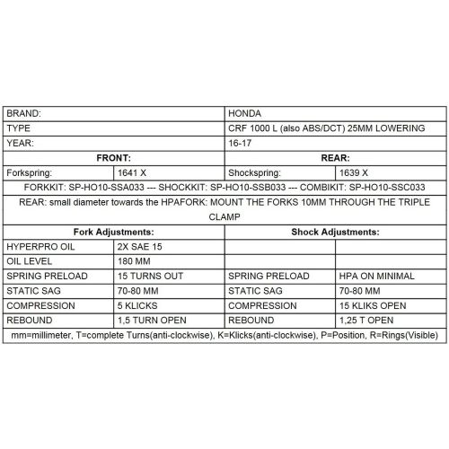 Replacement fork springs for lowering the front end by Dutch suspension specialists Hyperpro. This spring set provides you with a practical 25mm reduction in height without worsening the riding characteristics - at the expense of a little ground clearance. These progressive springs have been designed to match the Honda CRF1000L Africa-Twin perfectly, offering a tremendous improvement in response and greater safety in extreme situations than the original fork springs.
